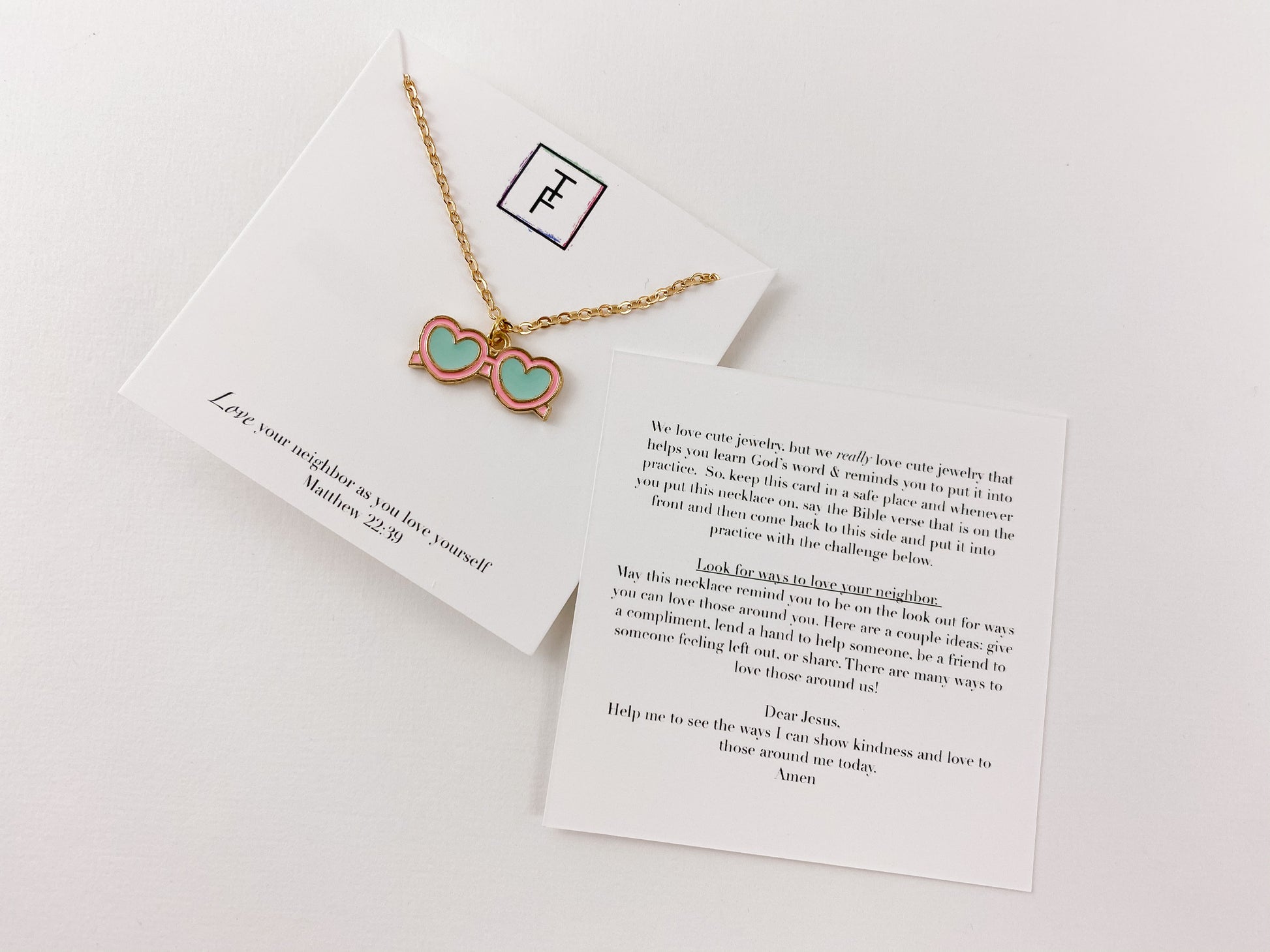 We love cute jewelry, but we really love cute jewelry that helps you learn God's word & reminds you to put it into practice. Each necklace comes with a that has the memory verse for the piece of jewelry, as well as a challenge to put it into practice.